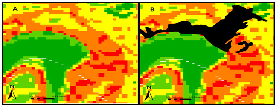 LSI results showing the influence of meander on landslide activity. The polygon represents the locations of past landslides. (A) Outer meander bend without landslide polygon (B) Outer meander bend with overlaid landslide polygon (black polygon).