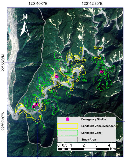 Landslide zone map with emergency shelter locations: A—Maolin Presbyterian Church; B—Maolin Elementary School; C—Wanshan Refuge House; and D—Dona Community Center and Dona Elementary School, Maolin District (base image: FS-2, 201011).