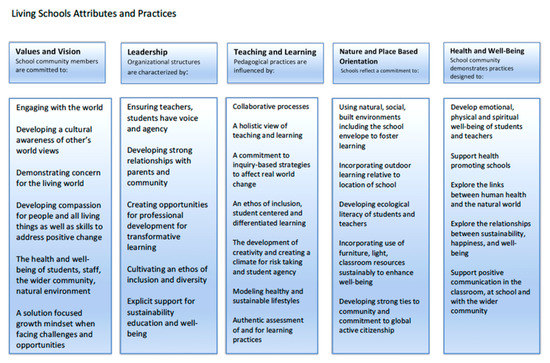 - Howard, P.; O’Brien, C. Living Schools Attributes and Practices. Available online: Sustainablehappiness.ca/sh-extra/attributes-of-a-living-school/ (accessed on 1 February 2019).