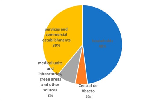 Mexico City, the capital and the most populated city in the country, is an increasingly globalized and spatially growing city in which MSW is a critical issue in terms of urban and environmental governance. The city consists of 16 boroughs and is spread over an area of 1485 km2. The estimated population of 9 Million [] generates 12,998 Mg of MSW per day, from which only 10,678 Mg are collected through public services [], while 48% of the generated waste stem from households, 39% from services and commercial establishments, 5% from Central de Abasto (the biggest wholesale market), and the remaining 8% from medical units and laboratories, green areas, and other sources (see Figure 1). Lack of proper solid waste management infrastructure is a striking problem due to the rapidly growing population. Further pressure is caused because people in urban areas consume 2–3 times more natural resources than rural inhabitants [].