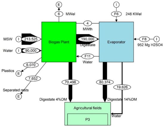 The mass flow diagram of the AD project discussed in this study is presented in Figure 2. The organic waste is delivered to the plant, where the contamination is sorted out. The part of the digestate is sent to the evaporator to reduce the water quantity, and then to the agricultural fields as a fertilizer. Sulphur acid is added to the digestate to fix the nitrogen in the evaporation process and convert it to a valuable plant fertilizer. The thermal power applied in the evaporator is the waste heat from the CHP unit, which is not used for self-supply of the plant. It is not enough to process the whole amount of output product; 70,498 Mg of digestate is sent directly to the fields.