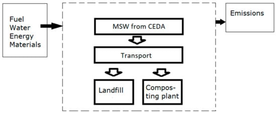 For the purpose of the analysis, the calculation of environmental impact was conducted with the life cycle assessment (LCA) software EASEWASTE []. EASEWASTE is designed for LCA of waste management systems and facilitates a comprehensive environmental impact assessment by calculating waste flows, resource consumption, and environmental emissions from individual waste processes within the system. The model allows flexible definition of individual scenarios and includes default data needed for the LCA calculation. The model calculates emissions into water, air, and soil, along with the consumption of resources, and applies life-cycle impact assessment (LCIA) methods for conversion of these exchanges into environmental impacts []. Also, EASEWASTE considers the biggest number of indicators compared to similar programmes [].