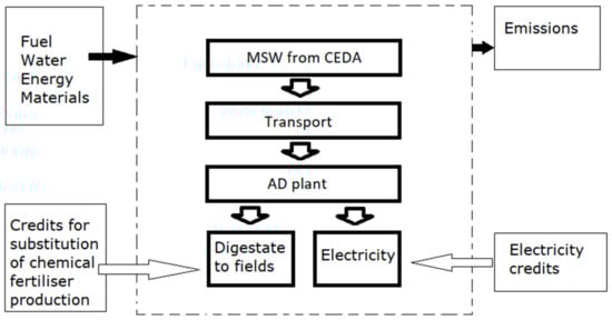 Energy derived from the AD system is regarded as a substitute for fossil fuel energy. Emissions into and alongside resource consumption, which would be avoided as a result of using a digester, are subtracted from the other emissions and resource consumptions in the waste system. The characterized environmental impacts assessed in this paper followed the IPCC 2007 methodology. The calculations were made using the database of EASETECH from July 2017. All the processes were based on the pre-modelled technologies existing in the database. The system boundaries are presented in Figure 1 and Figure 2.