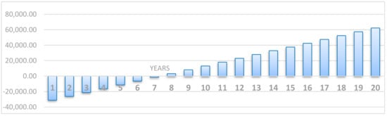 The NPV of an investment shows if the particular project is profitable for an investor or not, in comparison with the alternative one. When NPV is positive, the investment can be undertaken. A negative NPV means that the alternative project is more profitable []. The NPV estimation model has some shortcomings concerning the uncertainty and management’s flexibility to respond to uncertainty during the whole life of the project []. Nevertheless, the NPV approach is widely used to make investment decisions. The applied NPV is a before-interest benchmark. The debt in this case is disregarded due to the uncertainty about the conditions and the amount of credit the potential investor is going to get.