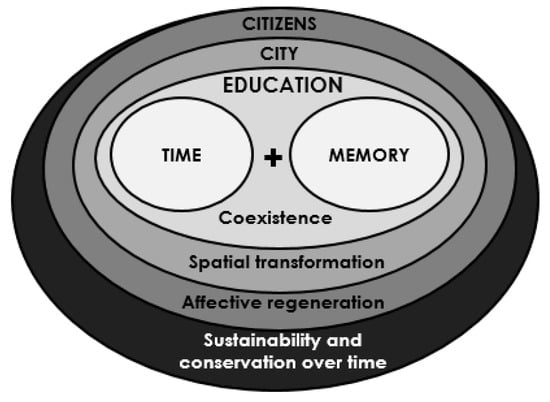 We must, therefore, highlight the main conclusion for this critical reflection, which reveals the link existing between a purely human condition, such as affection, and a whole series of fields of work apparently far removed from said emotive capacity, as were the necessary search for sustainability, the design of urban environments and environmental education, Moreover, it is love which is the characteristic which best defines us as human beings [], and as such, it will be only via this condition that we can conserve our environment, since we will only value and want to protect that which we love and to which we feel emotionally attached. A methodology and mutual relations that we could summarize in Figure 3.
