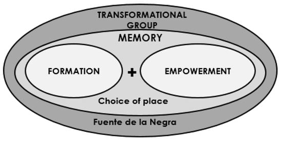 Taking into consideration, on the one hand, that, as Maturana said, “learning is the same as coexisting”, insomuch as all learning is “the transformation that takes place in coexistence” [] and, on the other hand, starting from the premise that affection is to be found in the structural base of all knowledge [] as well as in all we are and do [], we can finally set out the last piece of a methodology based on the construction of a sentimental and emotional link, whether it be with the group involved in the change, or with the placed transformed. Collective action, coexistence, which subsequently will become a memory, for the enhancement of the urban and/or natural environment in which we live and which will be the basis for the creation of a new affective link, or sometimes a recovered one, which will endow said group with the characteristics of a living organism [] capable of working for the conservation and enhancement of the sustainability of the ecosystem in which it lives and not destroy it and exploit it.