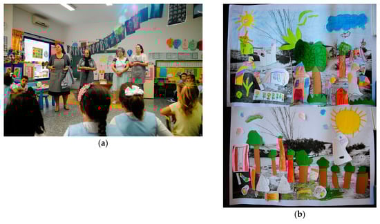 Figure 10. (a) Images of some educational activities developed by the Paterna Active Elderly Program, and the collaboration with the students of the Llano Primary School.; (b) Some works and intervention proposals for the regeneration of the Fuente de la Negra elaborated by the children of El Llano with the help of the women of the Paterna Active Elderly Program. - 29 October 2016: Preparation session for material to be used in the final project session. Together with several volunteers, as well as representatives of the Active Elderly group and the Secondary School in Paterna, the Ítaca staff prepared throughout the whole day the various materials which would be used in the participatory action on Monday 31, for the improvement of the Fuente de la Negra area.