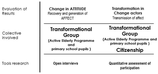 These groups played different roles, the main work being undertaken with the group of 15 elderly women between 65 and 85 years of age all born in this locality, given that they both initiated the process, and served as educators and facilitators for the rest of the participants. All of these issues are summarized in Figure 6.
