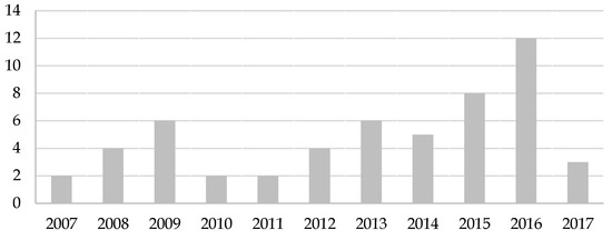 Out of 54 papers, 36 were journal papers while 18 were conference papers and conference proceedings. Figure 2 displays the chronological summary of the selected papers. It is clear that there was increasing interest in the topic of reverse logistics among researchers over the 10-year period depicted. This is indicated by 11% of papers published in 2009 and 22% published in 2016. The primary reason behind this trend is possibly the increasing awareness about sustainable and environmentally friendly practices among academics and industry stakeholders.