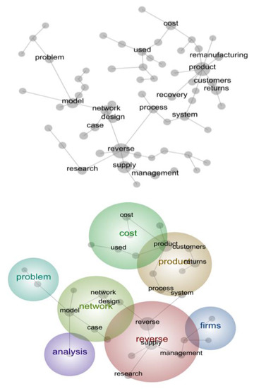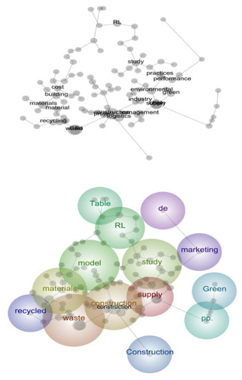 Firstly, we made a comparison between the reverse logistics literature in the non-construction industry (more matured industries) and the construction industry. This was done using a data mining software to obtain overall insight into the reverse logistics literature in the two groups, and creating a concept map, as indicated in Figure 3 and Figure 4. The main themes in the non-construction industry literature were “production”, “networks”, and “cost” (Figure 3; Tables S1 and S2), whereas “waste” became a major concept (74%) in the construction industry literature (Figure 4; Tables S3 and S4). Further examination revealed that the theme “material” intersected the theme “waste”. Meanwhile, the theme “recycled” strongly intersected the themes “waste” and “material”. Recycling appeared to be the main reverse logistics strategy in managing waste in the construction industry. These figures are evidence that, while more matured industries focus on reducing costs through producing and creating networks for reverse supply chains, the construction industry is trying to reduce waste by recycling waste materials.
