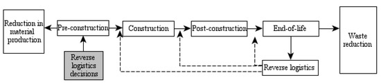 Although we argued that reverse logistics must be employed, particularly focusing on upstream construction activities, these aspects are rarely addressed in the literature, most of which only focuses on end-of-life waste management. As we emphasized previously, reverse logistics does not merely refer to waste management. Therefore, more studies are required to analyze the impact of reverse logistics on upstream construction activities. Hence, we propose a decision framework for reverse logistics with both forward and reverse flows in order to reap its environmental, social, and economic benefits, as illustrated in Figure 5. According to the framework, reverse logistics decisions must be made during the pre-construction activities where planning and designing take place.