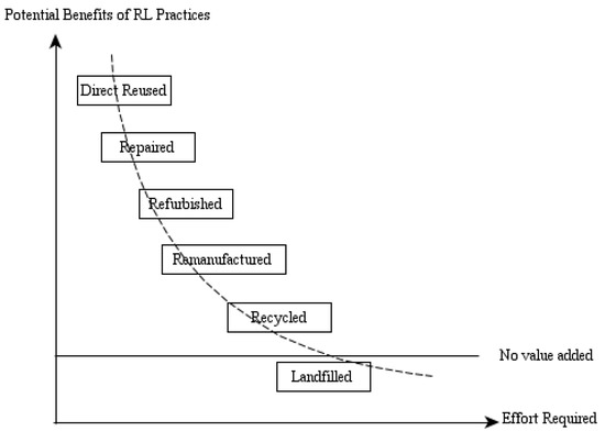 Researchers emphasized that the implementation of reverse logistics practices generate economic, environmental, and social benefits. Reverse logistics is economically beneficial, as it saves the cost of materials by reusing materials, earning revenue from the recovered materials, lowering the cost of waste disposal, procurement, inventory, transportation, and the maintenance of new products. The adoption of reverse logistics is environmentally beneficial, as it reduces non-toxic solid waste and CO2 emission by reducing energy consumption, using less raw materials, and adhering to legislative requirements. Socially, reverse logistics implementations reduce impact on neighbors, improve the image of the business, generate several jobs, and reduce all kinds of pollution [17,18,19].The forms of reverse logistics options prevalent are as follows: (a) direct reuse: products are directly reused without any repair when they are in good condition; (b) repair: failed products are repaired to restore to working order; (c) refurbish: products are disassembled, inspected, replaced, and repaired where necessary and upgraded to a different quality level; (d) remanufacture: products are disassembled, required parts are replaced, and quality standards are changed to be similar to a new product; and (e) recycle: products and parts are processed as materials that can be reused in new construction [20,21,22].
