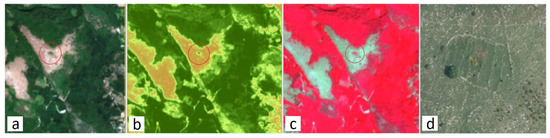 Site of Serra la Compra: (a) RGB Sentinel-2; (b) NDVI Sentinel-2; (c) NRG Sentinel-2; and (d) National Geoportal).