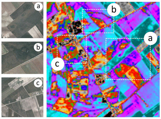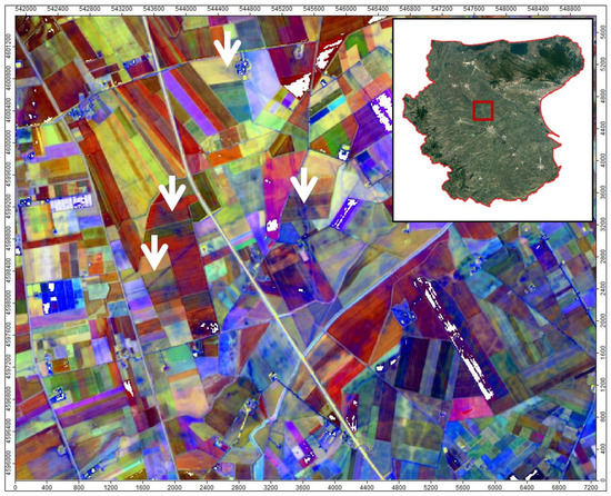 After the temporal analysis, Principal Component Analysis (PCA) was computed using the different indices. PCA is useful to reduce data redundancy providing a new series of less correlated bands, limiting the loss of information [63,64,65]. Spectral discrimination between surface components is more visible in the PCA than in individual bands. For example, in the case of Foggia, we have 10 Sentinel-2 tiles multiplied by the sum of processed indices and bands, plus three RGB colour composites for each tile. Thanks to PCA, we created an RGB colour composite using: R, first PCA band; G, second PCA band; B, third PCA band. The same procedure was done for the images of Sant’Arsenio.