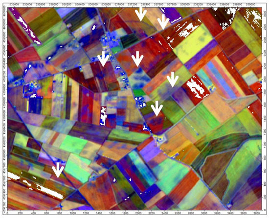 Two types of indices, vegetation health monitoring and soil analysis (Table 2), were focalised because they are the most commonly used in archaeology. They are useful to enhance crop and soil anomalies on the basis of spectral signature characteristics [46,47,48].