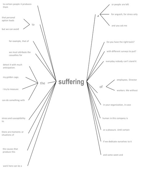 To draw this conclusion, any phrases dealing with the suffering of people at organizations were extracted from the texts of the transcribed interviews. These texts were read, and the meaning of the statements relating to the term being studied was analyzed, as well as other synonyms, their possible causes, and observable symptoms. The term that is the objective of our study (suffering, distress, affliction), or surrounding terms, appeared 57 times throughout the interviews conducted.