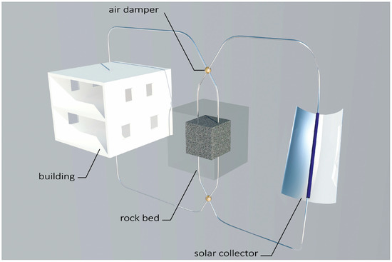 The considered heating system is made of two main components: a solar collector and rock bed storage (Figure 1). The working medium in the whole system is air, which after being heated in the solar collector is directed to either the rock bed storage or directly to the rooms of the building. During the night, as well as days with low insolation, heating of the interior takes place due to discharging of the bed storage. Depending on the location of the bed in relation to the building, it is also possible to use its heat losses for heating purposes.