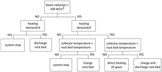 To date, the authors have conducted a lot of research in order to verify the correctness of the conceptual heating system. The verification stages are presented in detail in [23]. Within the framework of theoretical and experimental research, three test stands were built. The analytical model of a concentrating collector with internal ribbing was described in [24], while its experimental tests were presented in [25]. The model of the bed storage is included in [26], whereas tests of the cooperation of the collector and the bed storage, and results of simulation of the annual work of the system, are included in [23]. The principle of the operation of the solar heating system is shown schematically in Figure 2. The model operates with an hourly step using available meteorological data for a given location and by taking into account the angle towards the sun. The calculations were made using Mathcad 15 software and a spreadsheet with appropriate conditional formulas.