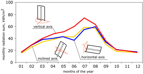 From the dataset of the typical meteorological year (TMY) for Wroclaw (Poland), which was developed on the basis of meteorological measurements that were conducted in the years 1971–2000 [27], data on direct solar radiation for each hour of the year were used. On this basis, calculations of the simulations of the amount of direct solar energy that is available for each of the three variants of the uniaxial tracking system were conducted. Analysis showed that 479, 413, and 398 kWh for each m2 of the area of the concentrator’s aperture were available for a vertical, horizontal, and inclined axis of rotation throughout the year, respectively. In the case of an inclined axis, an optimal angle of 67° for the whole year for Wroclaw, for which the amount of available energy is the highest, was determined with the aid of computational experiments. The amount of available energy for each month of the year is shown in Figure 3. The largest amount of energy is available for the collector with a vertical axis of rotation. However, the calculations assumed the full azimuthal rotation of this collector and a total lack of objects covering the Sun, such as trees and buildings. In practice, such a location of the installation would be very difficult to achieve. It would also be impossible to build a housing estate using such installations. Therefore, a collector with a horizontal axis of rotation, which is set in the direction of the southern azimuth, was chosen for further project work. Its advantage is that it has the smallest sensitivity to the occurrence of objects covering the Sun, as well as many possibilities of integration with a building’s structure.