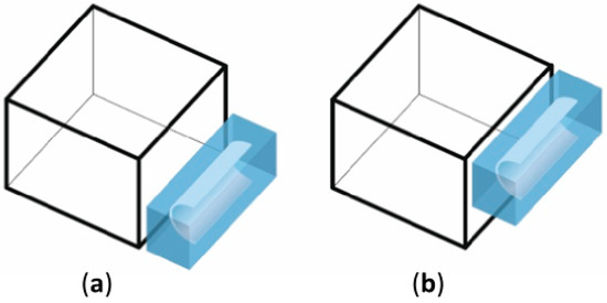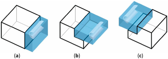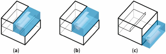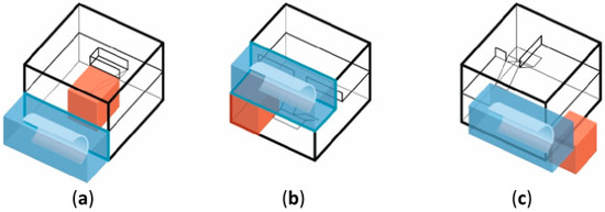 In the first variant, the integration of the bed storage can be inside the building in any location on the ground floor, and it is neutral for its projection. The bed storage may be adjacent to the side of the house, partially extended beyond the outline of the ground floor, or may be located in the center of the building forming a stratigraphic arrangement of rooms. In all cases, it takes any shape that is elongated or similar to a square (Figure 13a–c). The bed storage can also occupy two floors of the building in analogous configurations (Figure 14a–c).