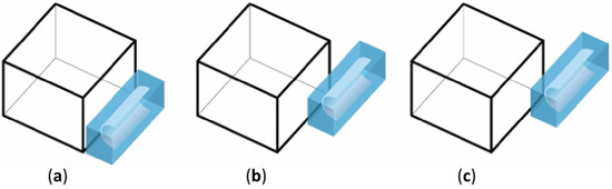 Schematic plan and model of a small integration of a collector and a house in horizontal arrangements: (a) total coverage of the facade, (b) partial coverage, and (c) small coverage.