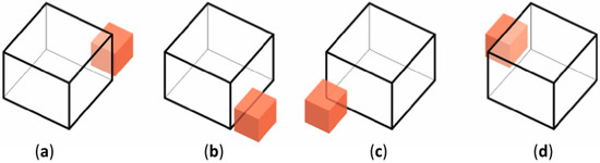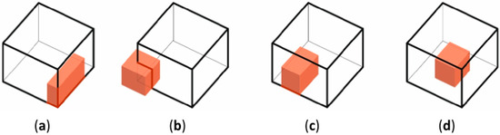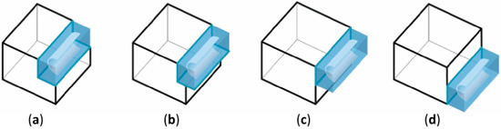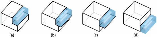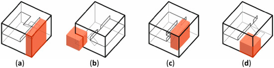 Scheme of the exposure of the bed storage in a functional arrangement: (a) the bed storage adjoins three sides of the house, (b) the bed storage adjoins two sides of the house, (c) the bed storage inside the house, and (d) the bed storage located centrally.