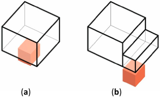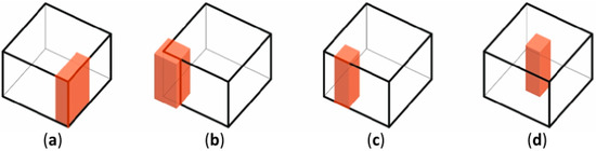 In the second variant, the integration of the bed storage is not only in the solid of the building, but is also exposed in the functional layout of the interior on two floors. It can occur in various configurations and sizes, while creating open interior layouts. As was the case in the previous example, the shape of the bed storage can be adjusted to the dimensions of the building or have an optimal shape of an equilateral cube (Figure 15a–d).