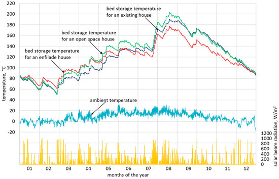 The annual analysis of the cooperation between the collector and the bed storage enabled the temperature of the bed storage to be determined as a result of the following: the energy supply from the collector, heat losses from the accumulator, and discharging of the bed storage for the purpose of covering heating demands. In each of the analyzed variants, the distance between the solar collector and the rock bed storage was not large. It was assumed that losses in air ducts would be compensated by insulating the conduits, as is the case in other heating systems. Figure 18 presents the changes in temperature of an accumulative material for the three considered cases and the direct radiation that was used in the calculations.