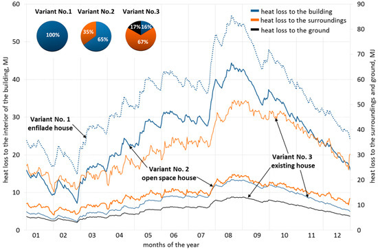 The above-mentioned heat losses gave different possibilities of usage in the case of the three integration variants. The first variant of the enfilade house experienced the greatest use of heat losses from the bed storage because the accumulator was located completely inside the building. In the variant of the open space house, the heat flux from two lateral surfaces was transferred to the surroundings. In the third and least integrated variant, it was only possible to use the heat loss flux from the bed storage for one of the sidewalls. The heat flux from the other three sides and top surfaces was transferred to the surroundings and from the bottom surface to the ground.