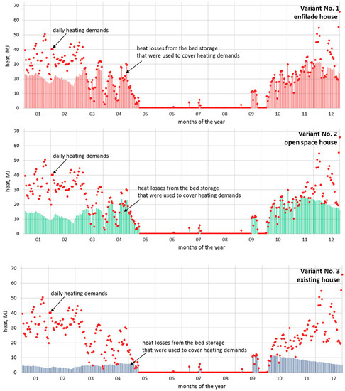 Figure 20 shows the daily heating demands of the building and heat losses that were used to cover these demands for the three analyzed variants. As shown in Figure 20, in the enfilade house that had the bed storage located completely inside the building, the losses from the bed storage almost totally covered the heating demands of the building in spring and autumn. During the year, the heat losses from the accumulator covered 78.32% of all demands. This caused a smaller discharging of the bed storage, which resulted in low energy expenditure on the fan’s operation. The bed storage was discharged mainly in winter. A similar situation occurred in the open space house because the differences in losses only resulted from the heat flux transmitted to the surroundings from the surfaces of two sidewalls. Coverage of the heating demands with the heat losses from the accumulator was equal to 61.32%. The lowest use of heat losses from the bed storage for covering the demands was in the case of the existing house, and it amounted to only 23.84%. As a result, there was a necessity to use almost twice as big a bed storage when compared to the two previous variants. The size of the solar collector’s mirror also had to be 50% larger when compared to the enfilade house. In the last variant, there was no need to remove heat to the surroundings from the room in which the accumulator was standing.