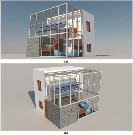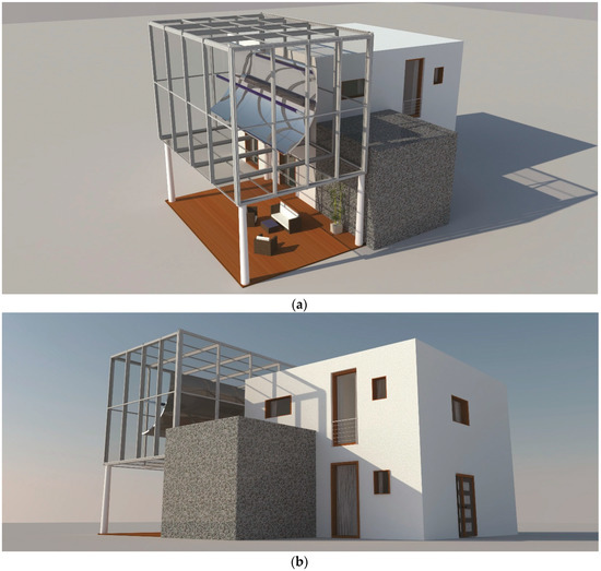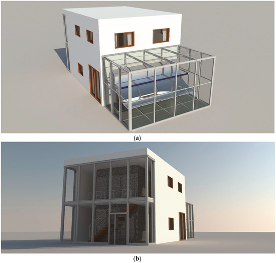 Visualization of the open space house: (a) south-east side and (b) south-west side.