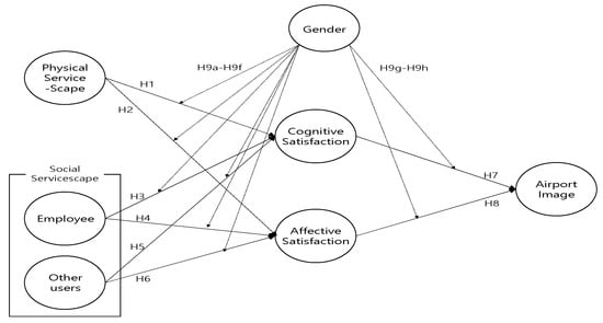 Differences in social identities such as gender and race have provided important indicators for an understanding of consumer behavior [42,43]. Gender-based differences have been analyzed in various studies. Okazaki and Hirose [44] argued that gender played an important role in predicting purchase intention by analyzing consumers’ use of media. When investigating quality response according to gender, Sanchez-Hernandez et al., [45] found that men were more sensitive to the physical environment quality and result quality, and that women were more sensitive to the interaction quality. This is because men displayed a result-oriented propensity while women demonstrated a strong society-oriented propensity to internalize themselves in society [42]. In addition, according to Meyers Levy and Sternthal [46], it turned out that women understood meaning through comprehensive clues while men depended on clues clearly revealed. Thus, the present study attempts to determine whether gender creates a moderating effect in the relationship of the influence of social servicescape, including the physical servicescape of an airport terminal as well as employees and other customers, on cognitive satisfaction and affective satisfaction. In addition, according to Kandampully & Hu [47], satisfaction with an experience appeared to lead to a positive evaluation of the image, and as such, the present study assumes that there is also a moderating effect of gender in the relationship of the influence of cognitive satisfaction and affective satisfaction with the airport image.