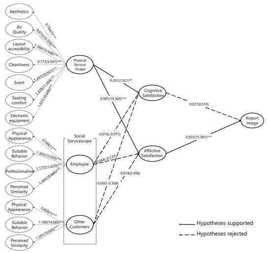 As a result of an analysis of the impacts of physical servicescape on cognitive satisfaction and emotional satisfaction, the impact of physical servicescape on cognitive satisfaction was = 0.201, C.R. = 2.921 (p < 0.05), and the impact of physical servicescape on emotional satisfaction was =0.981, C.R.=10.369 (p < 0.01), respectively. Thus, there were statistically significant effects. It is concluded that these results from the reflection of the characteristics of T2, which was designed to be a smart airport with a short opening period, and an airport that applies up-to-date science and technology such as self-service tech and guide robots. Meanwhile, of the dimensions of social servicescape, the impact of the employee factor on cognitive satisfaction was = −0.016, C.R. = −0.075, while the impact of other visitors on cognitive satisfaction was = −0.060, C.R. = −0.364, respectively. The impacts of employees and other visitors on cognitive satisfaction and emotional satisfaction were = −0.044, C.R.= −0.237 and = 0.074, C.R.= 0.496, respectively. These values were statistically insignificant. These results indicated that social aspects of the airport are less likely impacted than that of the physical environmental factors. H7 focused on the relationship of cognitive satisfaction and emotional satisfaction with airport image = 0.027 (0.510), so there were no statistically significant effects. The results for H8, which centered on the relationship between emotional satisfaction and airport image were = 0.855, C.R. = 15.941 (p < 0.01), which were statistically significant. These results reflected the fact that in the formation of an airport image, rather than rational judgment or reasonable service quality, emotional response elements through pleasant experiences and good feelings were critical. As a result of the above testing of the research hypotheses, H1, H2, and H8 were supported while H3, H4, H5, H6, and H7 were rejected. The results of the hypothesis testing are shown in Table 4 and Figure 3.