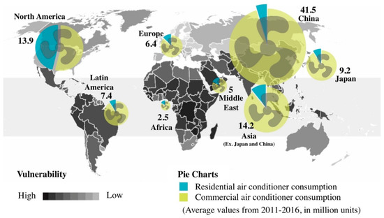 - The Japan Refrigeration and Air Conditioning Industry Association. World Air Conditioner Demand by Region. 2017. Available online: https://www.jraia.or.jp/english/World_AC_Demand.pdf (accessed on 23 March 2019).