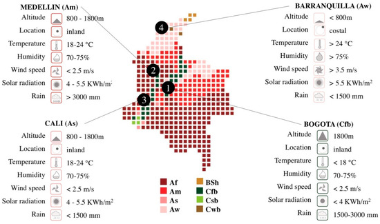 Figures from the 2018 census reveal that Colombian population is comprised by 45.5 million people, which—according to the UN estimates—places it amongst the 30th most populated countries in the world, the 13th within tropical countries and the 3rd in Latin America (after Brazil and Mexico) [13]. A large percentage of its population (77.8%) lives in main cities, 7.1% in small settlements and 15.1% in rural areas [14]. Colombia´s largest cities have very different climates. For example, its capital Bogotá—located at 2547 m above sea level, with an average temperature of 14 °C and 73% relative humidity—is considered a cold climate type Cfb (in the Köppen–Geiger classification). Medellín—located at 1490 m, with an average temperature of 22 °C and 68% relative humidity—is considered a tropical monsoon type Am. Cali—located at 961 m, with an average temperature of 23 °C and 73% relative humidity—is considered a tropical warm-dry climate type As. While Barranquilla—located in a coastal zone at 52 m, with an average temperature of 28 °C and 80% relative humidity—is considered a wet-dry tropical climate type Aw (Figure 2) [15].