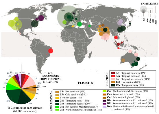 Deficiencies in data collection and fieldwork methodologies are one of the biggest challenges faced in thermal comfort research since the accuracy of the theoretical models relies greatly on the quality of the recorded data from real buildings. Another significant limitation is geographic coverage. Even when the study of thermal comfort has received a great deal of academic attention in recent decades, there is still a general lack of research in tropical contexts and climates, compared to other regions in the world. General bibliometric searches can roughly evidence this. For example, a Scopus search with the terms “thermal comfort” carried out on 27 January 2019 displayed 20,011 documents (including 2702 open access). A total of 87% of this information was published after 2000 and 62% after 2011. Six countries lead research in this area: China, the United States, the United Kingdom, Italy, Japan, and Germany with 48% of all the published production. All of these countries are located above the Tropic of Cancer, except China which has a small portion of territory below this border.