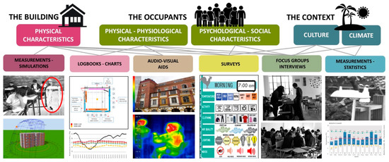 In the case of the school buildings, the question’s language, interface, and complexity of the recommended surveys were found to be entirely unsuitable for children. Therefore, new surveys were designed and implemented. Alternative data-collection tools were also tested in these projects, for example, thermographic photographs, observation logbooks, interviews with focus groups, phone surveys, building management databases, and dynamic thermal simulations (Figure 5).