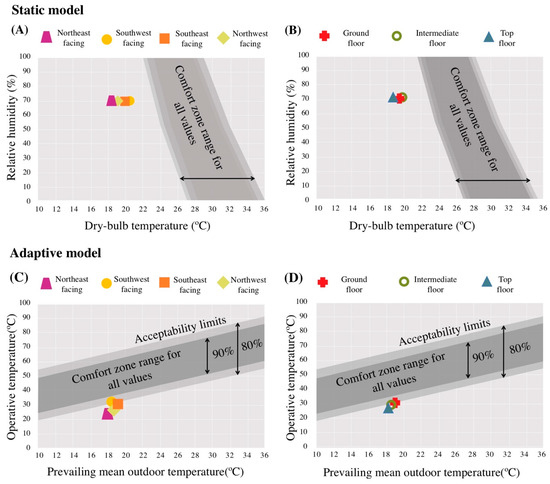 Example of conflictive results with the static and the adaptive models. (A,B) Dry-bulb temperature-relative humidity charts based on the CBE tool [42] for the static model (PMV) for (A): apartments according to orientation and (B): apartments according to vertical position. (C,D) Operative temperature - prevailing mean outdoor temperature charts based on the CBE tool [42] for the adaptive model for (C): apartments according to orientation and (D): apartments according to vertical position.