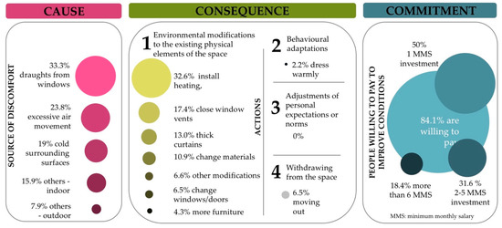 Apart from the static and adaptive models, no other alternatives were found for the systematic analysis of the other wide range of variables that were collected during fieldwork. In most of the literature, these were usually evaluated at the researcher’s discretion. The most compelling option identified was a theory of environmental satisfaction [37] developed to help interpret and study the occupant’s modes of adaptive behaviour. This theory classifies and rates the process undertaken by individuals in an effort to mitigate discomfort. It was applied to develop and analyse the surveys in all four projects and considered to be useful to identify and evaluate the architectural characteristics that contributed to creating thermal discomfort, the actions taken by the occupants and their commitment to finding a solution. In the case of project 1, when occupants were asked in the survey what was the best way to improve the current situation in their apartment, 32.6% of them replied that it was by installing heating devices (Figure 8). Additionally, a large majority of them (84.1%) were willing to pay to improve their thermal comfort.