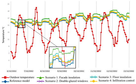 If the results from the evaluation with the static and adaptive models and the answers to the occupant’s satisfaction questions are viewed alone, they may suggest the need for the introduction of mechanical conditioning. However, when all the data collected through alternative tools were analysed together, it suggested that the main problem was the poor thermal performance of the overall building’s envelope. Most of the sources of discomfort were found in the facades (Figure 8). Possible solutions developed through dynamic thermal simulations during the second part of the project indicated that this problem could be solved just by a moderate increase in thermal mass and the improvement of air-tightness. Figure 9 shows four potential retrofit scenarios that were considered: (1) Insulating the facade with 60 mm thick fibreglass insulation. (2) Changing the existing single glassed windows for double glassed windows. (3) Insulating the floor with a 30 mm thick polyurethane layer. (4) Minimising infiltrations by sealing window and door frames. These four scenarios were evaluated using the coldest week of an average year in Bogotá (6–12 October 2002). It was observed that, in this case, the most efficient strategy to increase indoor temperatures was scenario 1 followed by scenarios 4 and 2.