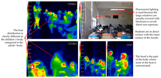 In the case of projects 3 and 4, the measurements also showed a lack of compliance with the standards; however, in the surveys, the satisfaction levels were significantly higher compared to projects 1 and 2. It was found that the occupants surveyed in the housing projects (mainly adults) tended to perceive the environment as being much colder than the occupants surveyed in the school projects (mainly children). The observations recorded in the logbooks, the analysis of the audio-visual material, and the discussions in the focus groups were crucial to understanding comfort levels in projects 3 and 4. For example, the thermographic photographs helped to visualise differences between heat distribution in the adults’ bodies compared to the children’s bodies (Figure 10). The face is the part with the highest concentration of thermoreceptors in the human body [44]; therefore, the measurements were taken at average face height for children in standing and seated conditions, and not at the height recommended by the standards (based on adults). Additional measurements were made at other heights and locations to study stratification, asymmetries, and drafts within the space.