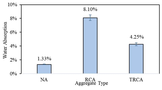 The water absorption tests were performed on NA, RCA and TRCA and the results are shown in Figure 5. As can be seen, the water absorption of the RCA is considerably higher than NA. Untreated RCA sample showed 8.1% of water absorption, which is in the range of reported water absorption values in the literature between 5% and 17% []. It is attributed mainly to the presence of primary adhered mortar of RCA []. However, the results showed that the surface treatment of RCA with lithium silicate solution had a significant influence on the water penetration and decreased the absorption about 50%. In fact, lithium silicate fills the RCA porous network which corresponded to the reduction of water penetration of TRCA. It indicates that the lithium silicate solution treatment provides a suitable coating and enhances the physical performance of RCA. Thus, this treatment was found effective to densify the RCA structure by reacting with the presented mortar in the aggregate. The immersion of RCA into lithium silicate resulting in a hydration reaction between free calcium and lithium silicate and forms C-S-H gel and consequently a decrease in water absorption []. More discussion about the effect of surface treatment on microstructure is given in Section 3.7.
