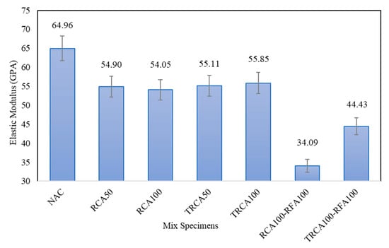The results of elastic modulus of all designated SCC mixes are shown in Figure 9. All SCC mixes containing untreated RCA and TRCA exhibited significantly lower elastic modulus than the reference sample mix, NAC. As RCA replacement level increased in the mixes the elastic modulus decreased. This is in agreement with Alengaram, Salam [] which reported a decrease of 17.7% in modulus of elasticity of RCA-SCC when compared to the control sample. As can be seen there is a reduction of about 10 GPa in elastic modulus of RCA-SCC samples in comparison to NAC. The treatment of RCA using lithium silicate exhibited an increase in the elastic modulus of TRCA50 and TRCA100 samples compared to RCA50 and RCA100. The improvement observed in the elastic modulus of the TRCA50 and TRCA100 can be explained with the presence of good interface bonds between RCA and cement paste which consequently reduce the propagation of cracks during loading [,,]. Furthermore, the incorporation of RFA resulted a significant drop in elastic modulus; however, treatment of RCA using lithium silicate solution showed a significant improvement in elastic modulus of TRCA100-RFA100 sample when compared with RCA100-RFA100.