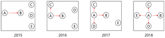 SNA involves actors and links, in which the nature of the latter constitutes the network. At the network level, average degree, centralization, and efficiency were used while degree was used for the actor level, in line with previous studies [35,36,37,38,39]. There are, however, challenges in capturing changes in social relations over time for SNA that may present a problem to the study [40]. Despite how observations were made at discrete time points, Snijders [41] observed that the resulting dynamics is a result of a continuous time-process. In agreement with Bidart and Lavenu [42] (p. 360), “personal networks have a history. The form and structure they show today result from a construction elaborated over time.” Thus, if a connection changed at an initial time, it was assumed in this study that the tie would not change, as SNA can involve static assumptions [43]. In this way, given that the interviewees disclose the year they acquainted with the actors they refer to in the surveys, data prior to 2018 could therefore be retroactively obtained (Table 6; Figure 1).
