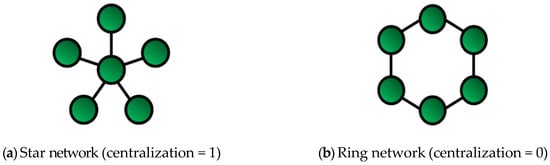 Second, the study looked at centralization and efficiency to analyze the characteristics of the network structure. Centralization is expressed as a ratio between 0 and 1, while its visual (Figure 2) is a “concentration map” that intuitively identifies herding: this can be expressed as in Formula (2) [37]:
