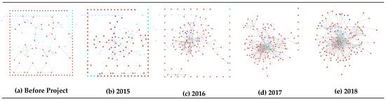 According to the annual growth, the network appeared to have formed in 2015 and activated about twice every year until 2017, as long-term residents who were once strangers to each other came to interact more frequently (Figure 4). The network growth appears concurrent with the efforts of the support center outlined earlier (Table 1), and especially so in regard to the various skill-building activities, such as urban regeneration education programs and public contests held in April 6, 2016 (Table 9).
