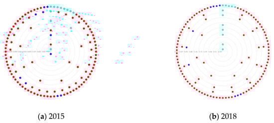 Figure 5. Centralization map for years 2015 (a) and 2018 (b).