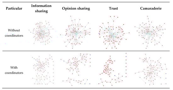 The present study selected survey questions to examine the Jangwi community network according to the relationships (“information sharing,” “opinion sharing,” “trust,” and “camaraderie”), in consideration of community competence and social capital (Table 5; Tables S1 and S2). The four relationships are features that facilitate interaction among members of the community; the criteria and questions were patterned after the work of CYRAM [35], a programming company and SNA software developer, with a research institute that regularly conducts SNA for South Korean governments and businesses.