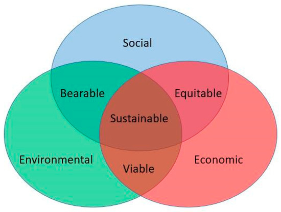At a generic level, sustainable development is oftentimes understood as a practical process in which economy, environment and society are brought together in a balanced way, particularly by reconciling conflicts between these three elements [18]. Sustainability relies on the successful maintenance and enhancement of the three dimensions of sustainability, i.e., environmental, social, and economic resources [19].
