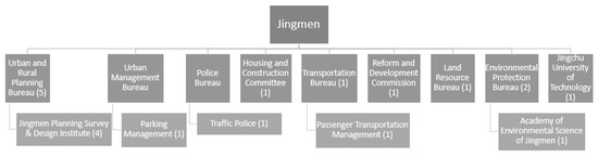 The interviews were conducted mainly with public professionals from the city of Jingmen. A few choices with regard to the selection of interviewees warrant justification. For the case, it was important to enquire professionals from the departments and agencies which have a role in the development of the railway station and the surrounding areas. Therefore, local government agencies with this focus were identified and selected. Second, since the JWRS was in its planning stage, external companies or organizations were not yet involved in the design and planning of the project. Therefore, the selected respondents were predominantly from various government departments and branches within the city. In addition, an interviewee from a local university, Jingchu University of Technology, was added to the set of respondents to obtain a more comprehensive view of the JWRS and its surrounding area. This resulted in a mixed background of interviewees, from engineers to policy makers. Figure 3 shows the various departments/branches/agencies of public professionals who were selected for the interviews.